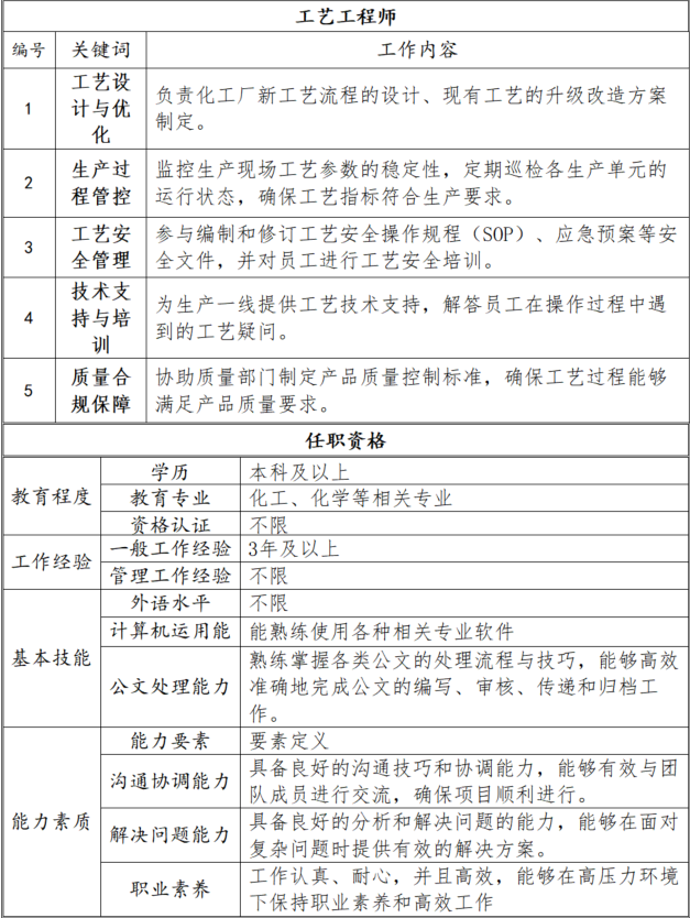 基本要求:本科,安全工程相关专业,需持有注册安全工程师(化工方向)证,3年及以上相关工作经验