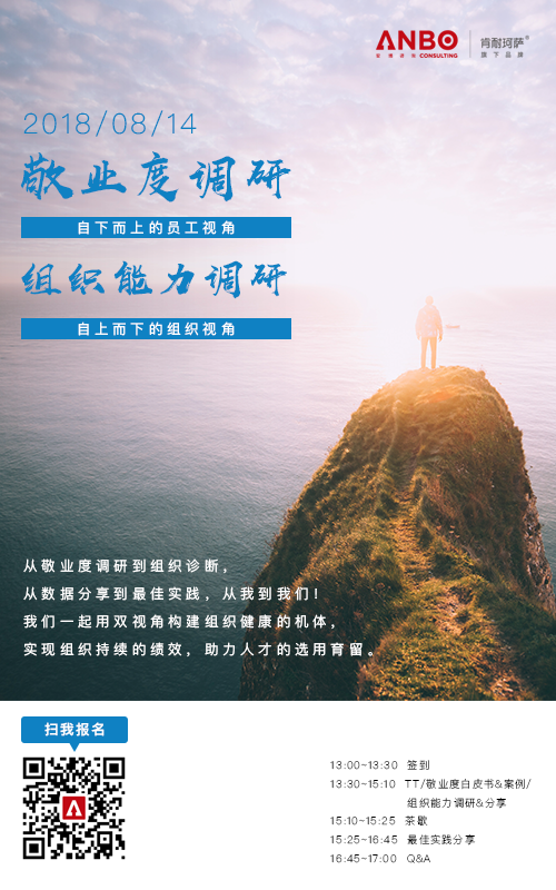 6. 在8月14日,也就是下周二,我们会有一场《敬业度调研&组织能力调研》活动,这是一场双视角的活动,敬业度调研是自下而上的员工视角,组织能力调研是自上而下的组织视角,用双视角构建组织健康的机体,实现组织持续绩效,助力人才的选用育留。本次活动我们会邀请到KNX中国区组织人才发展副总裁、北京公司总经理Terence Tian 作为主分享嘉宾,同时我们还特别邀请了盘子女人坊的人力资源总监。对于企业来说,调研有哪些价值呢?我们从三个维度进行了解读: