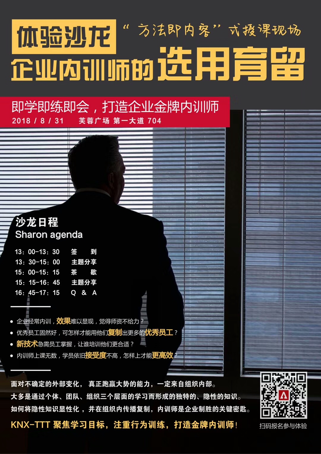 7. 第二场活动是在8月31日,主题为《企业内训师的选用育留》。在VUCA时代,面对不确定的外部变化,真正跑赢大势的能力,一定来自组织内部。内训师通过将隐性知识显性化,萃取组织智慧,赋能团队人才。这场活动我们将为邀请到两位非常资深的培训讲师,第一位相信我们非常多的湖南企业已经很熟悉了,在世界500强跨国工作20余年,担任销售、运营和人力资源发展等高级管理职位,并担任跨国企业中国区培训与发展负责人——钱建纲老师。第二位是黄震炜老师,黄老师是肯耐珂萨TTT认证的专家培训师,曾担任波音航空、格拉瓦培训负责人。可以说这场活动有4个亮点: