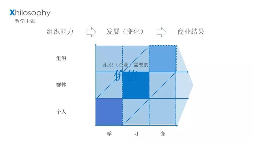 12. 我们认为组织学习分为三个阶段:第一个阶段是学,也就是我们所说的认知阶段;第二个阶段是习,即实践阶段;第三个阶段是变,即固化阶段。组织透过对新的信息的认知接收,对新的行为习惯的实践达到最后的固化过程,从而形成我们达成持续绩效的途径。