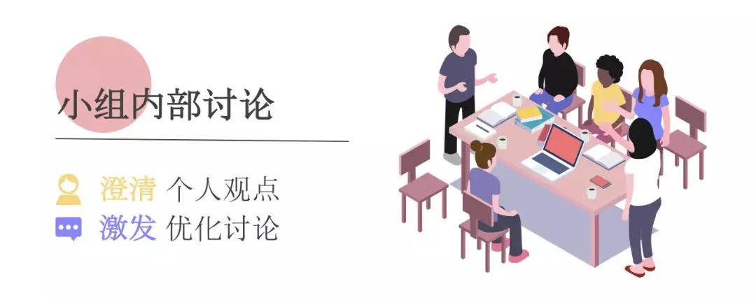 二是小组内部讨论,每人发表自己的观点、澄清自己的想法,互相讨论激发并生成优化想法,此环节持续时间较长,需要预留充分的时间供大家讨论互动。