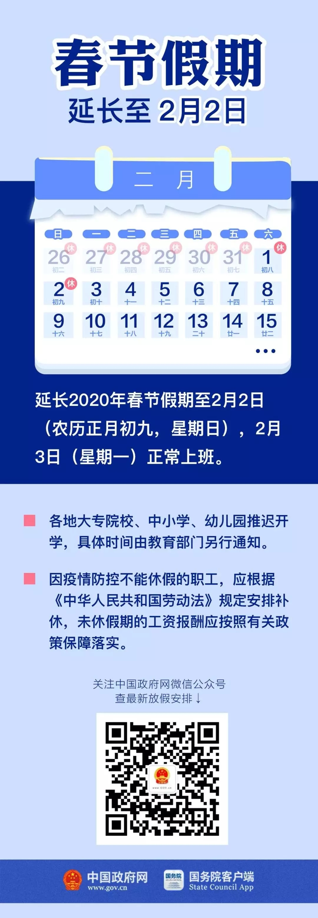 经国务院批准,为加强新型冠状病毒感染的肺炎疫情防控工作,有效减少人员聚集,阻断疫情传播,更好保障人民群众生命安全和身体健康,现将延长2020 年春节假期的具体安排通知如下。
