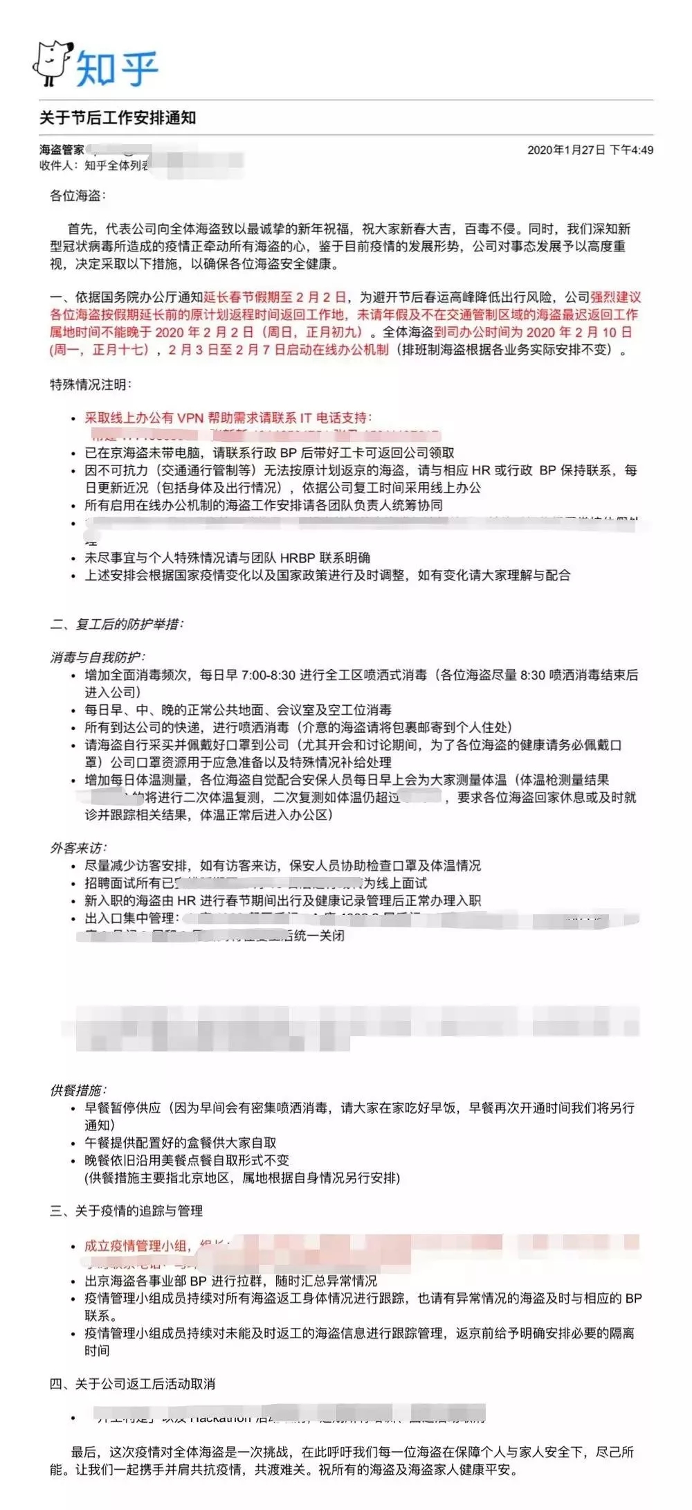 一、2月1日、2月3-7日启动在家办公机制,暂定2月10日(正月十七)返岗上班;