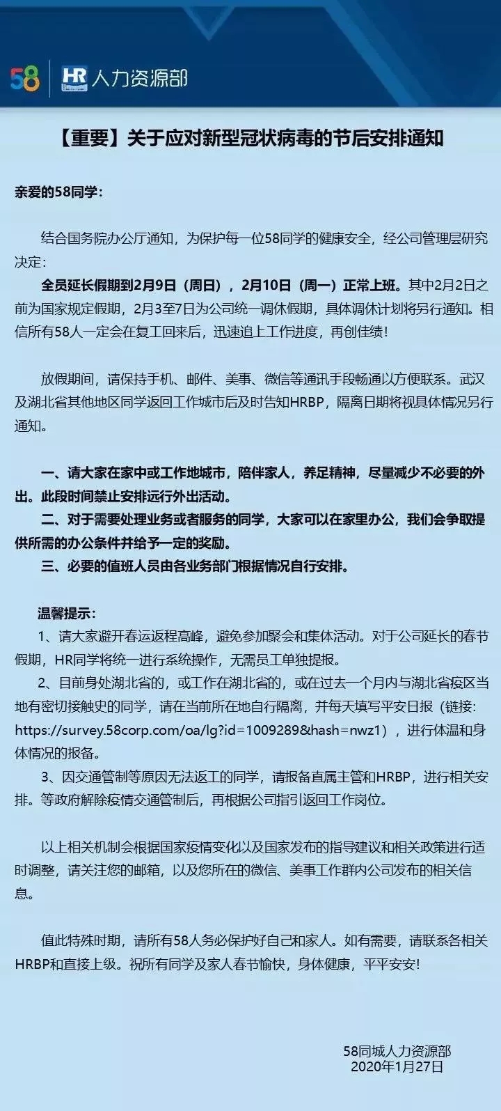 2、北京、上海等总部、研发、职能等功能型办公区员工,2月3日开始远程办公,2月10日返回公司办公室上班。部分城市有从异地返程后在家隔离观察的需要,后续我们将根据疫情走势及各城市政府政策进一步明确公司政策。建议同学们根据具体情况错峰返程,避开2月2日前后、2月9日前后两个高峰,并全程注意保护自己。