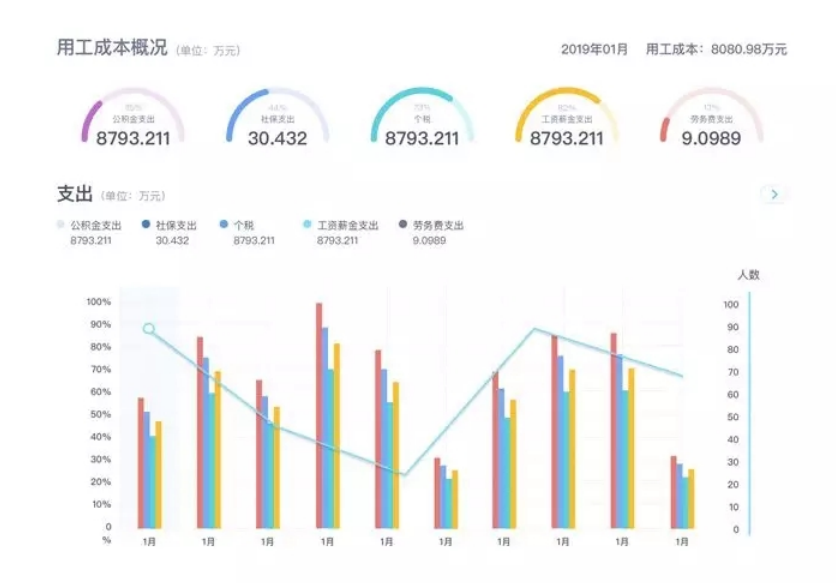 按月实时更新公积金、社保、个税、工资薪金发放情况,让企业用工情况和用工成本一目了然,HR再也不用单独制作用工成本统计表。