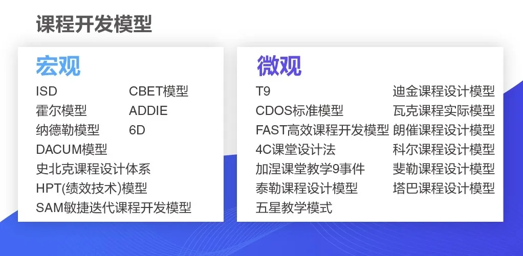目前市面上普遍使用的课程开发模型大致可以分为两类:宏观的和微观的。