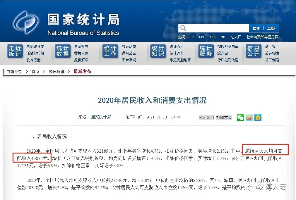 2021年1月18日,国家统计局官网发布《2020年居民收入和消费支出情况》,公布2020年全国城镇居民人均可支配收入为43834元。(国家统计局官网数据网址:http://www.stats.gov.cn/tjsj/zxfb/202101/t20210118_1812425.html)
