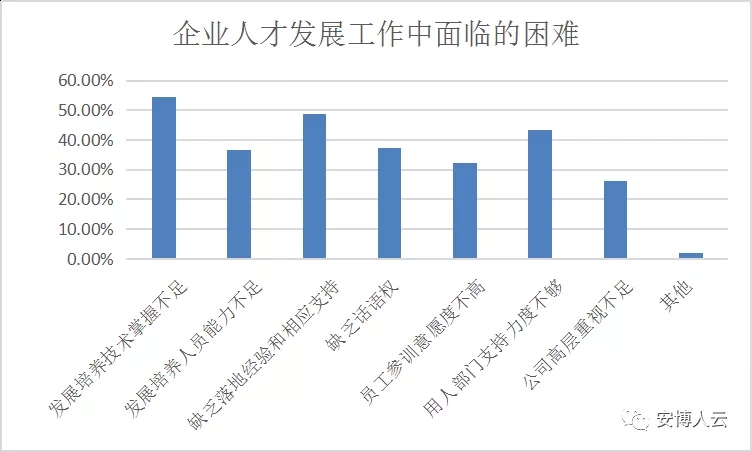 本次受访企业在开展人才发展工作过程中面临的主要困难包括:对于人才发展培养技术掌握不足、缺乏相应的落地经验和资源支持,以及用人部门支持力度不够,其他还存在发展培养人员能力的不足、人力资源部门缺乏话语权、员工参训意愿度不高等。