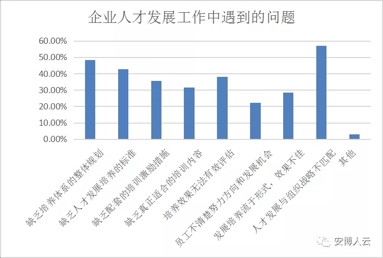 根据调研结果显示,参与本次调研的企业在人才发展工作中面临的最主要的问题是人才发展与组织战略不匹配、与业务目标无结合,缺乏人才发展体系的整体规划,缺乏人才发展配套的标准以及缺少配套的培养激励措施,其次还包括发展培养的效果无法有效评估,发展培养工作流于形式、效果不理想,缺乏真正适配的培训内容,员工不清楚本岗努力的发展方向和发展机会的大小等等。