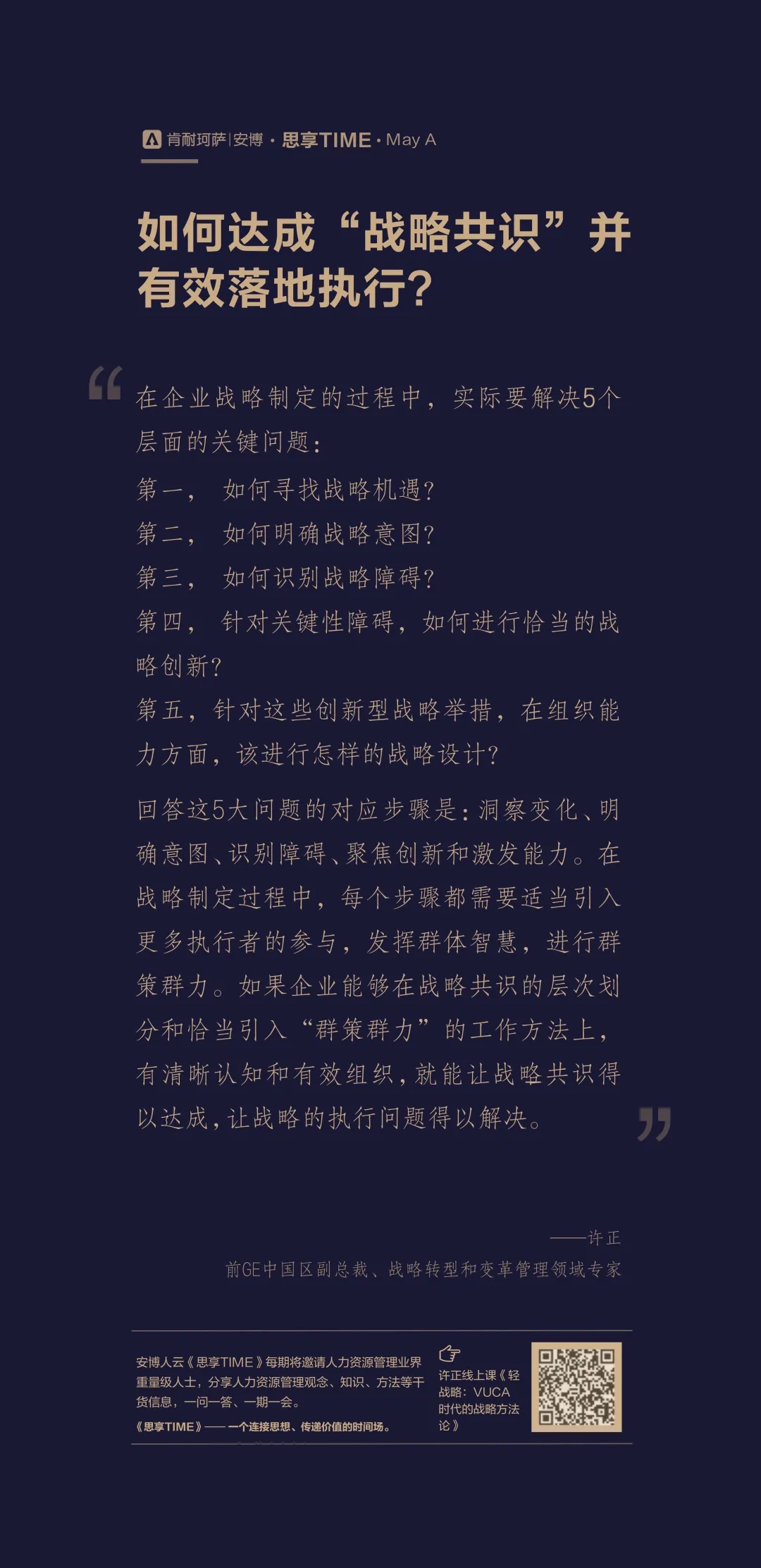 本期《思享TIME》特邀嘉宾是前GE中国区副总裁、战略转型和变革管理领域专家许正老师。他认为,企业在制定战略的过程中,每个步骤都应该引入更多执行者的参与,充分激发群体智慧,来推进战略共识的达成和战略执行的落地。