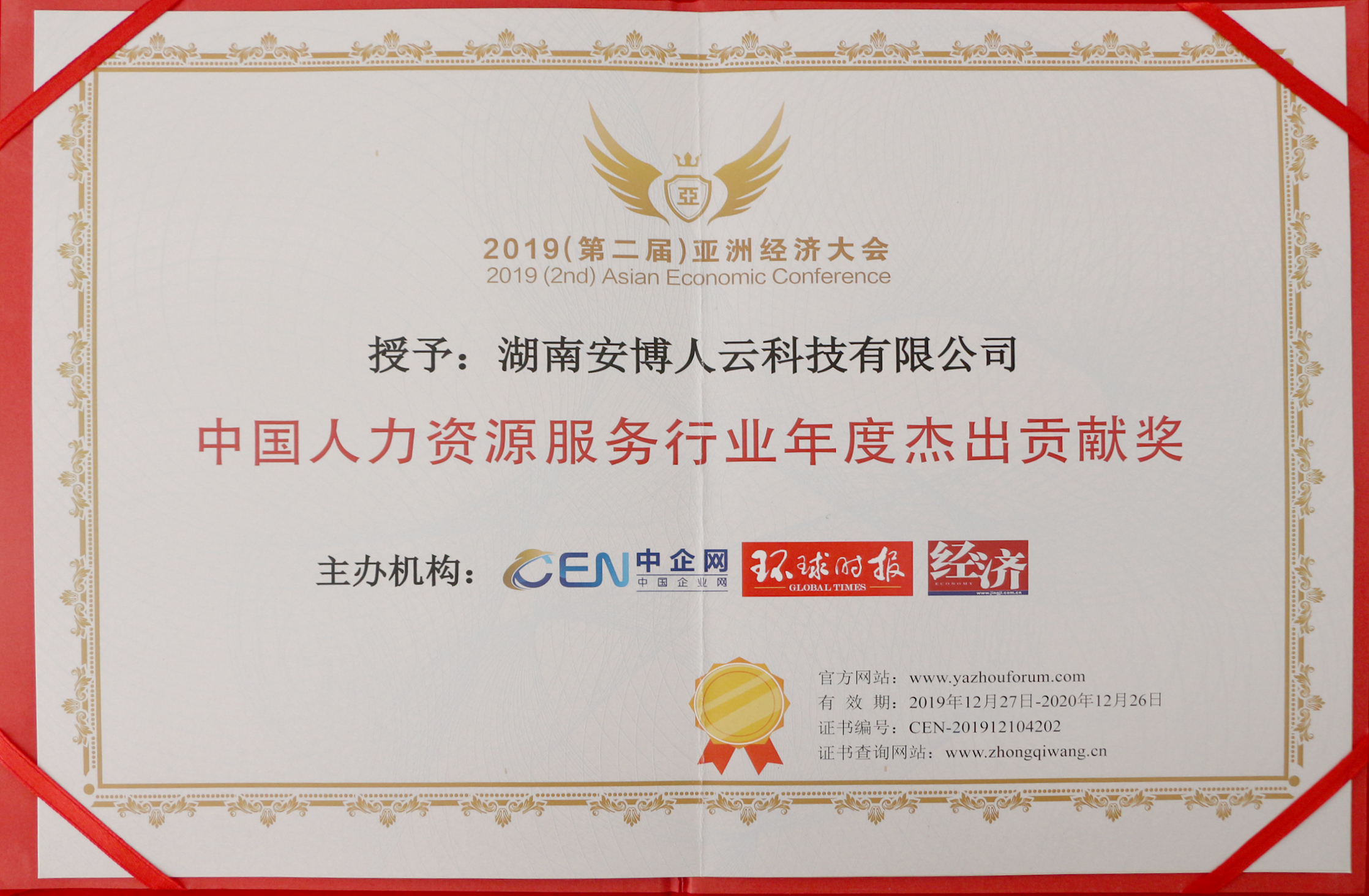 亚洲经济大会“中国人力资源服务行业年度杰出贡献奖”