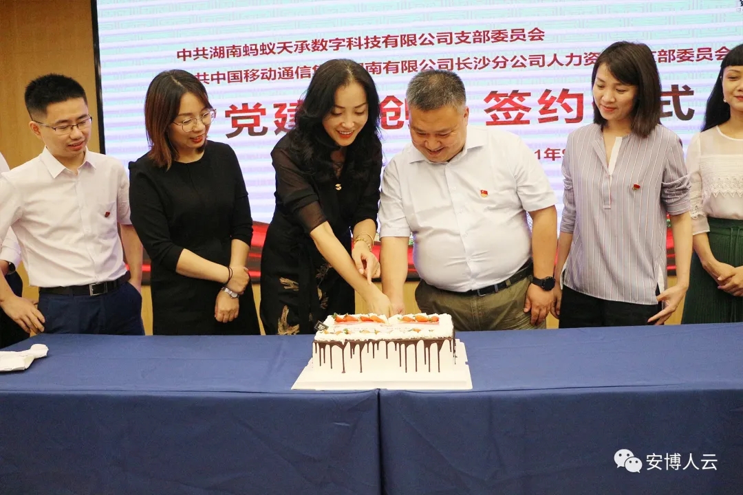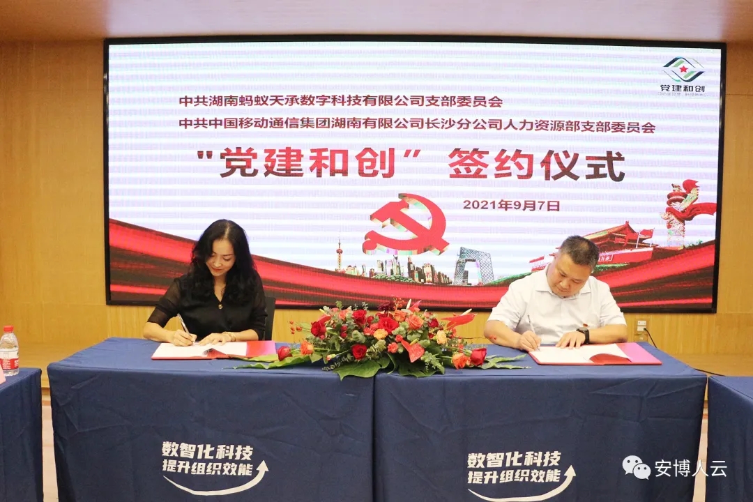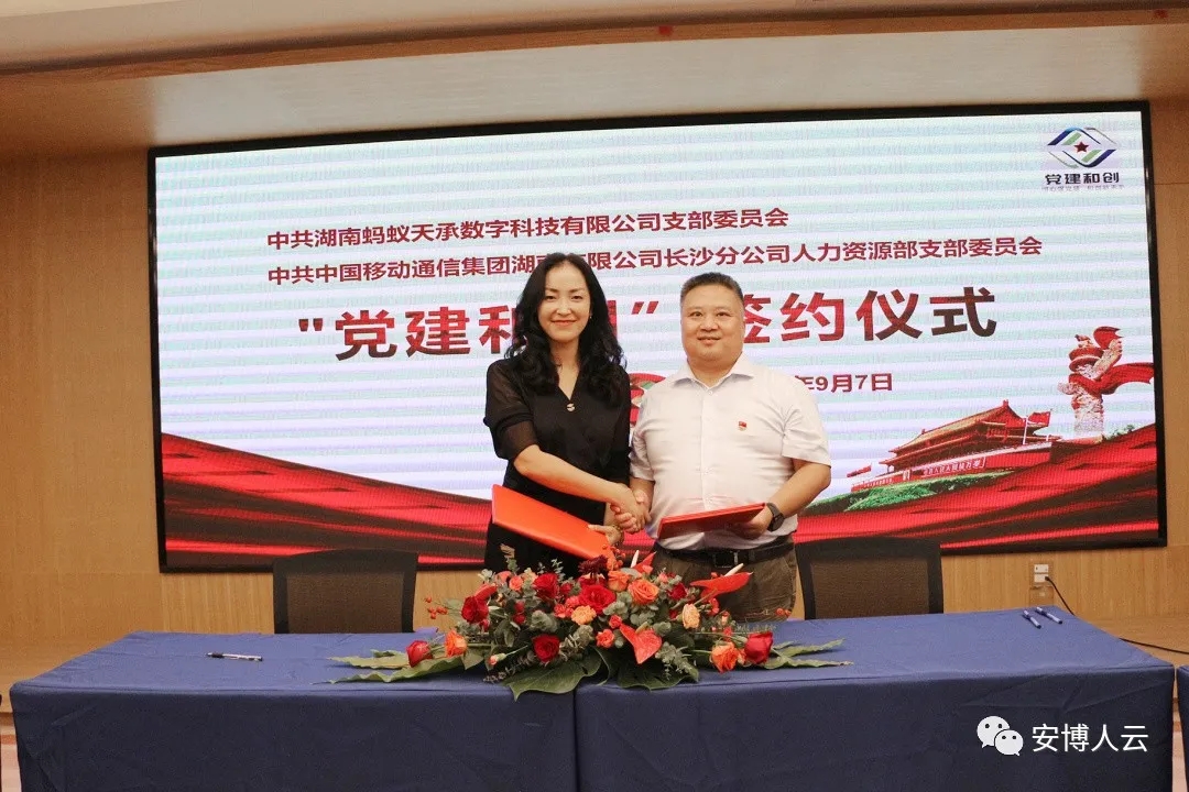 9月7日,中共湖南蚂蚁天承数字科技有限公司支部委员会和中共中国移动通信集团湖南有限公司长沙分公司人力资源部支部委员会的“党建和创”项目签约仪式在肯耐珂萨·安博多媒体厅举行。