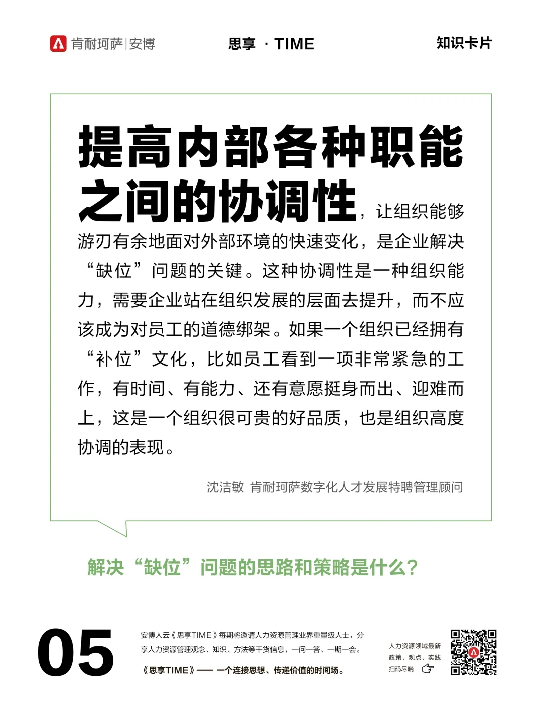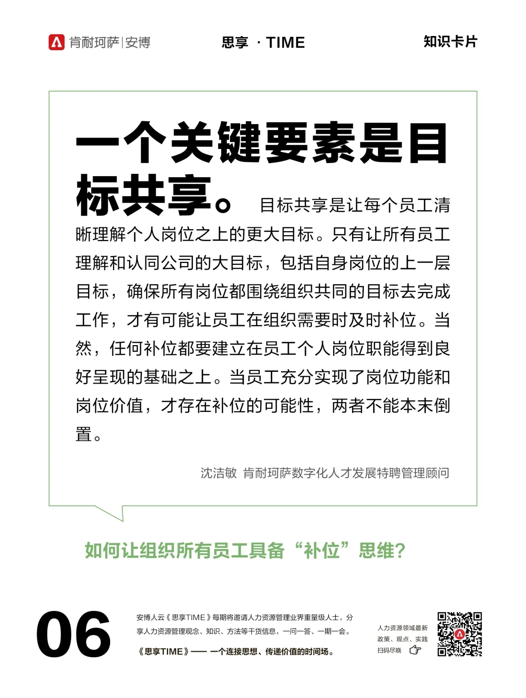 本期《思享TIME》特邀嘉宾是肯耐珂萨数字化人才发展特聘管理顾问沈洁敏。面对很多企业中长期存在的关于“缺位”、“补位”、“越位”的纠结现象,沈洁敏老师认为,一味要求员工“补位”,无法解决根本问题,还容易适得其反。他强调,解决问题的一个关键要素是目标共享,只有让所有员工理解和认可企业的大目标,才能为“补位”创造可能性。