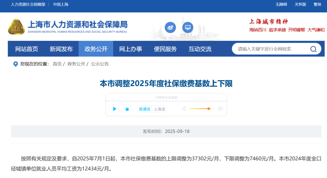按照有关规定及要求,自2025年7月1日起,本市社保缴费基数的上限调整为37302元/月,下限调整为7460元/月。本市2024年度全口径城镇单位就业人员平均工资为12434元/月。